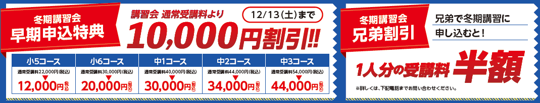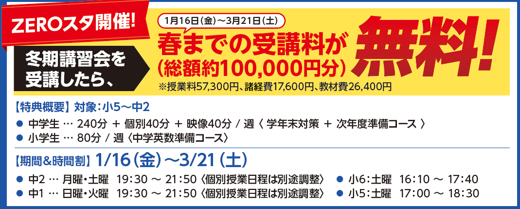 ・冬期講習にご参加頂くと,約2か月分の授業+教材費+諸経費が無料!!